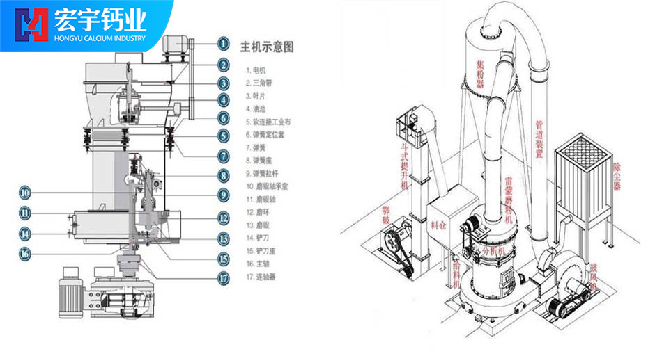 高壓磨粉機(jī)主機(jī)內(nèi),磨輥吊架上緊固有1000-1500公斤壓力的高壓彈簧。開始工作后,磨輥圍繞主軸旋轉(zhuǎn),并在高壓彈簧與離心力的作用下,緊貼磨環(huán)滾動,其滾動壓力比同等動力條件下的雷蒙粉機(jī)高1.2倍,故產(chǎn)量大為提高。 當(dāng)被磨物料進(jìn)入磨腔后,由鏟刀鏟起送入磨輥與磨環(huán)之間進(jìn)行碾壓,碾壓后的粉末隨鼓風(fēng)機(jī)的循環(huán)風(fēng)帶入分析機(jī),合格細(xì)粉隨氣流入旋風(fēng)集粉器即為成品,大顆粒物粒落回重磨。循環(huán)風(fēng)返回鼓風(fēng)機(jī)再重復(fù)以上過程,余風(fēng)則進(jìn)入袋式除塵器凈化。當(dāng)磨輥與磨環(huán)達(dá)到一定磨損后,調(diào)整高壓彈簧長度,保持磨輥與磨環(huán)之間恒定碾壓力。從而保證穩(wěn)定的產(chǎn)量與細(xì)度。